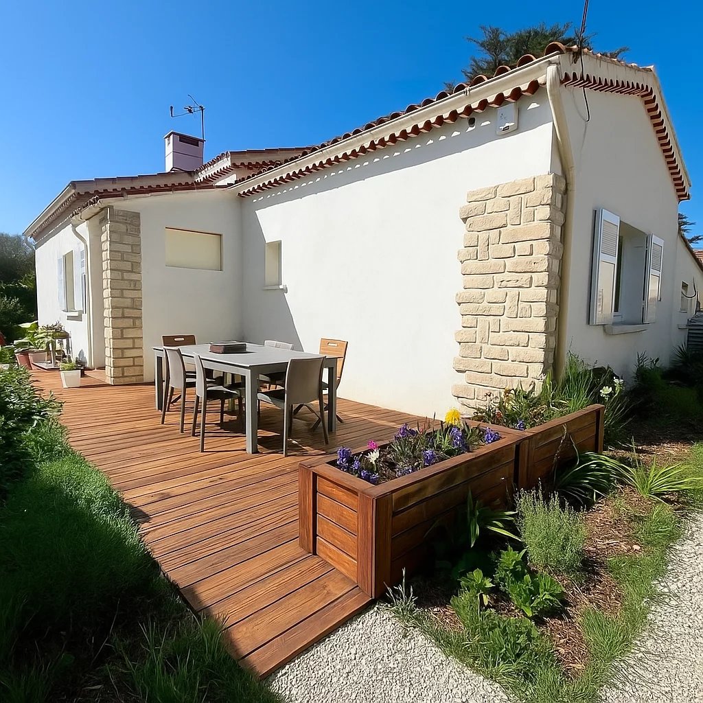 A l'extérieur, vous disposerez de terrasses, d'espaces verts pouvant accueillir une piscine et d'un cabanon permettant du rangement.